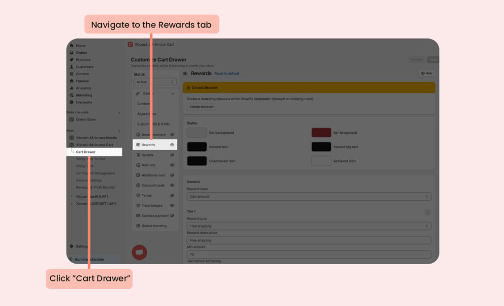 First, please create discounts (automatic discount or free shipping) using Shopify’s Discounts feature. These will be applied via the Rewards function.