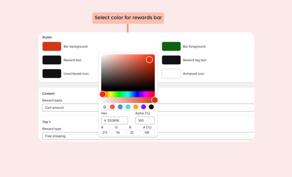 Customize rewards bar’s colors, reward descriptions, text before achieving and text after completing full rewards bar as you want.