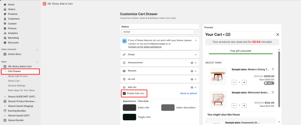 • Navigate to Cart Drawer and scroll down to Add-ons field.