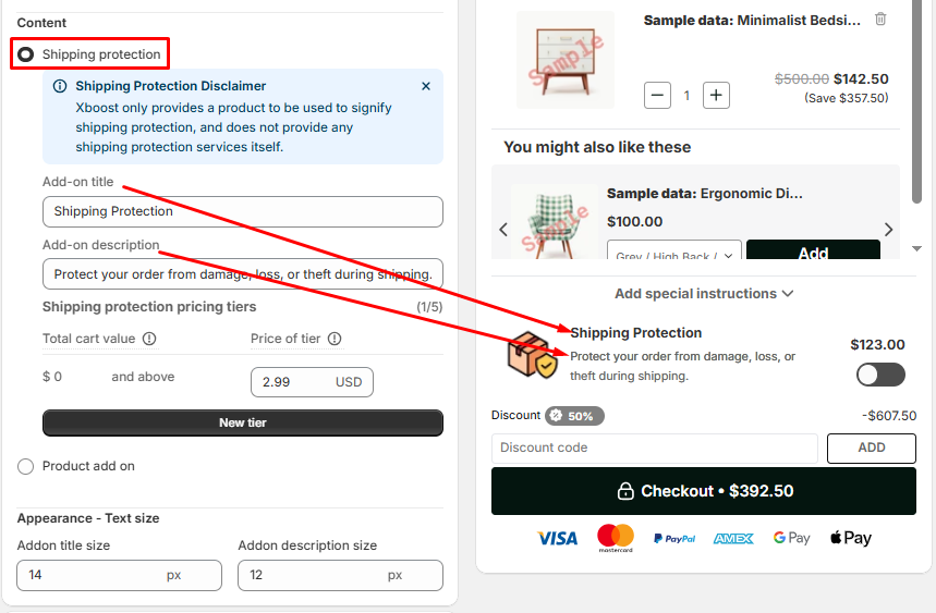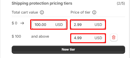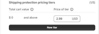 • Click New tier to add more shipping protection level. You can configure the range of total cart value and price of the shipping protection.