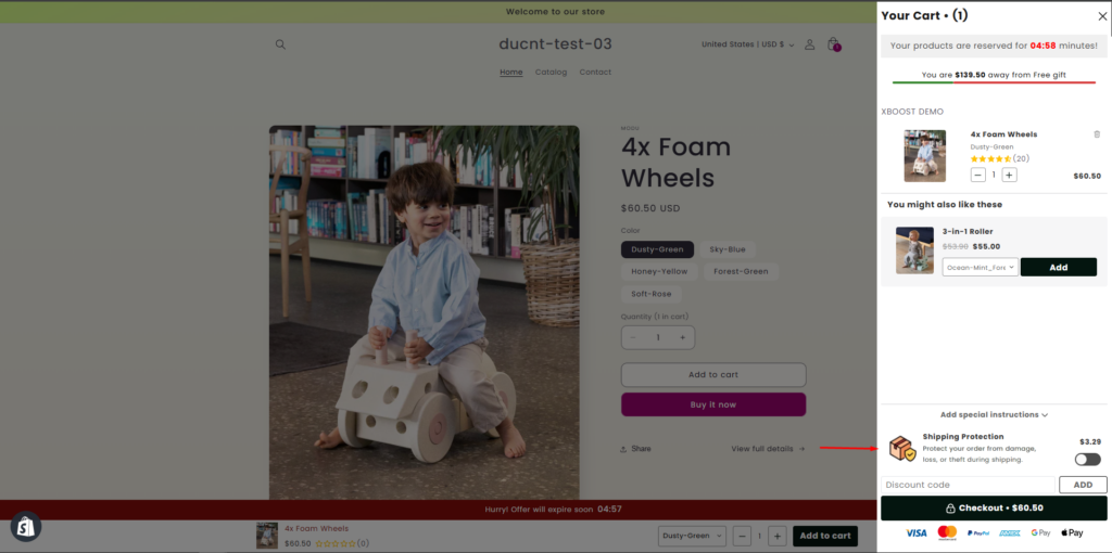 The shipping protection is automatically generated as a product in the store’s product list and will be displayed in your cart when you open it.