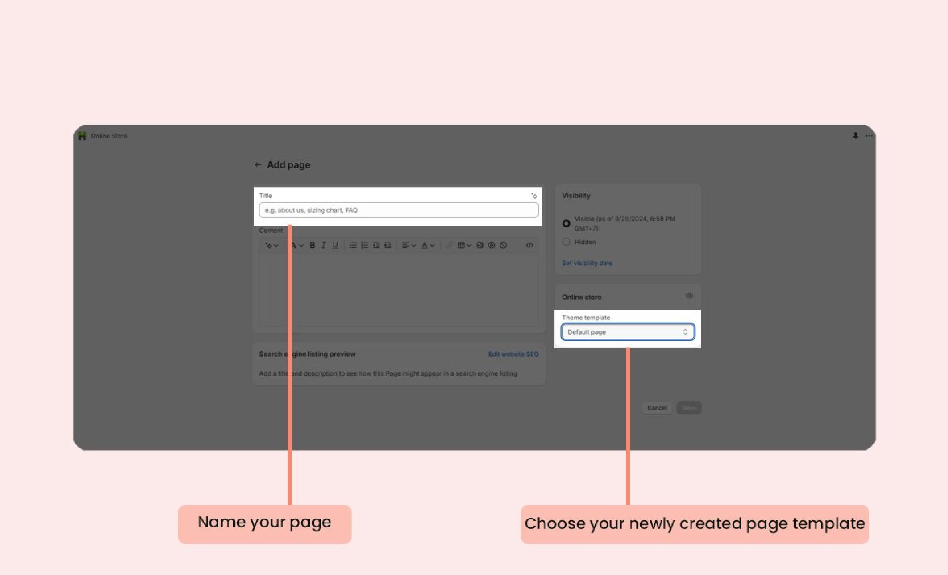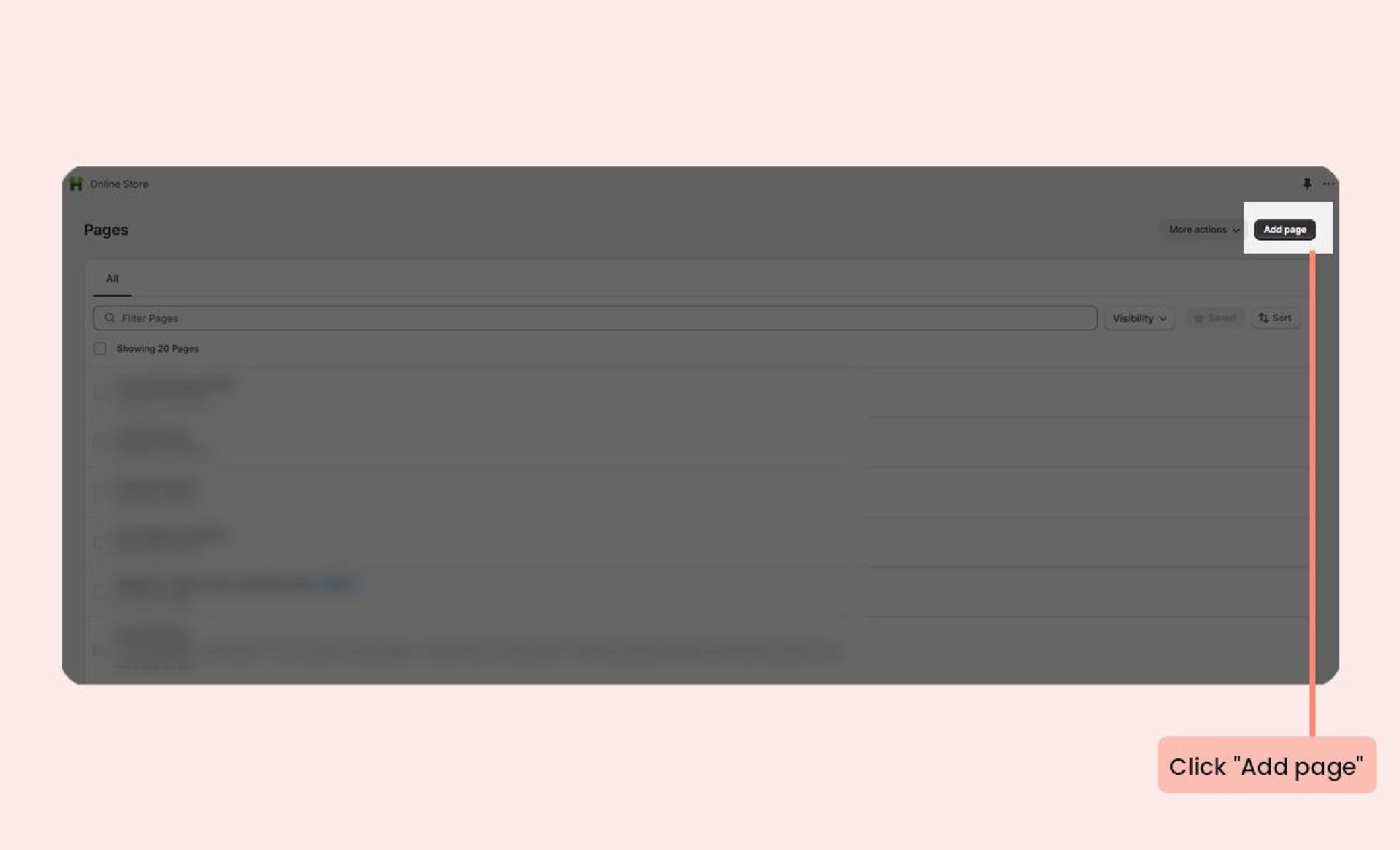 - Next, in the Shopify Admin’s Pages menu, click Add page.