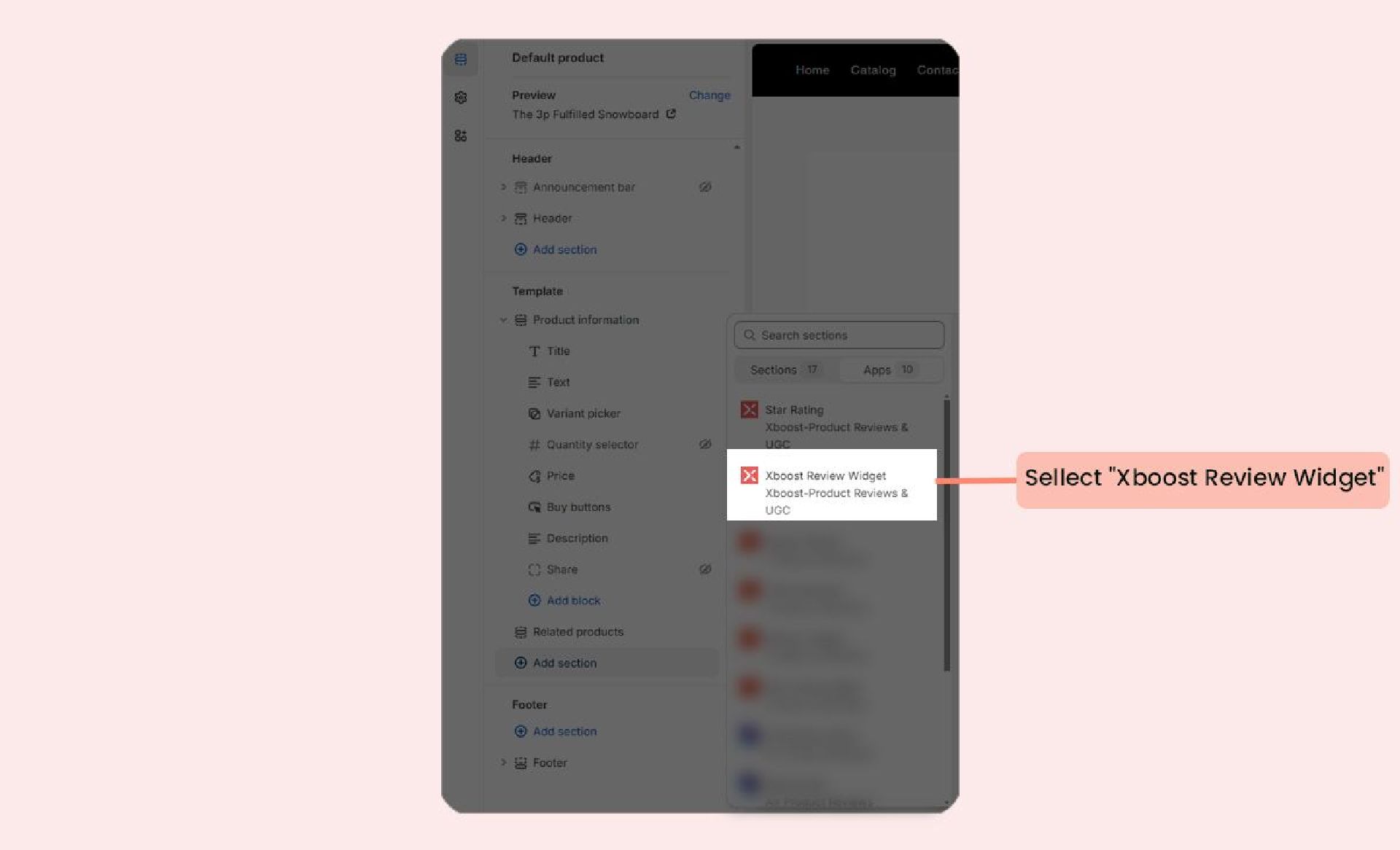 - In your new page template, click Add section under Template and select Xboost Review Widget