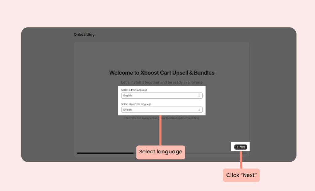 Once you’ve clicked Install the app, this will start the onboarding process. Select admin language and storefront language and click Next to Enable Xboost: AI Upsell & Bundles: