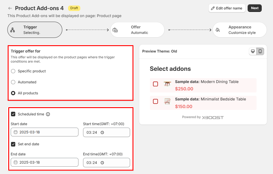 We have 3 options for trigger product: - Specific product: You can view and select products. The offer will be displayed and triggered only for the specific products you selected.