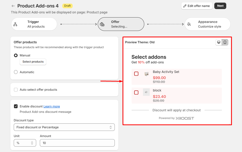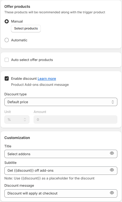 – Automatic: The offered products will be displayed automatically by the recommendation source you selected. You can also select the number of products shown in the offer. - Tick on Enable discount to enable the discount.