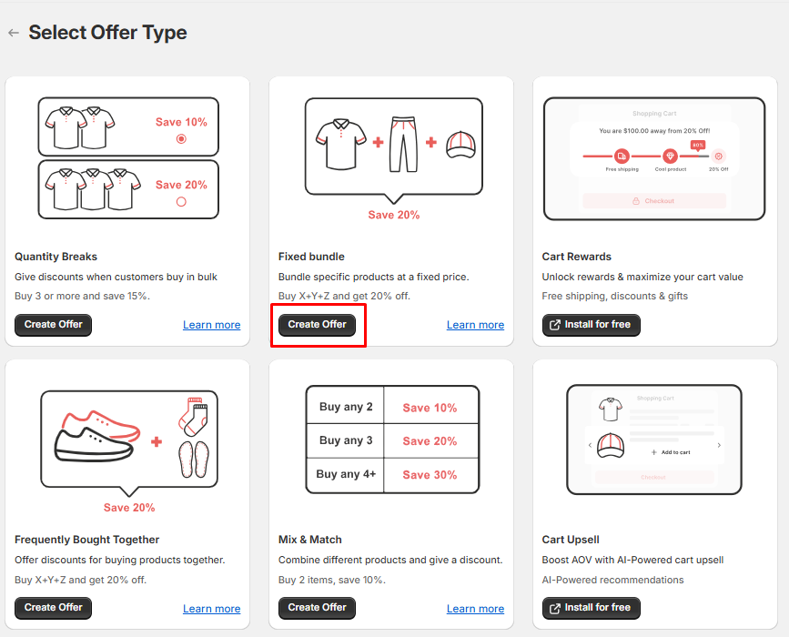- Click Create offer from the Xboost: AI Upsell & Bundles app’s offers page.