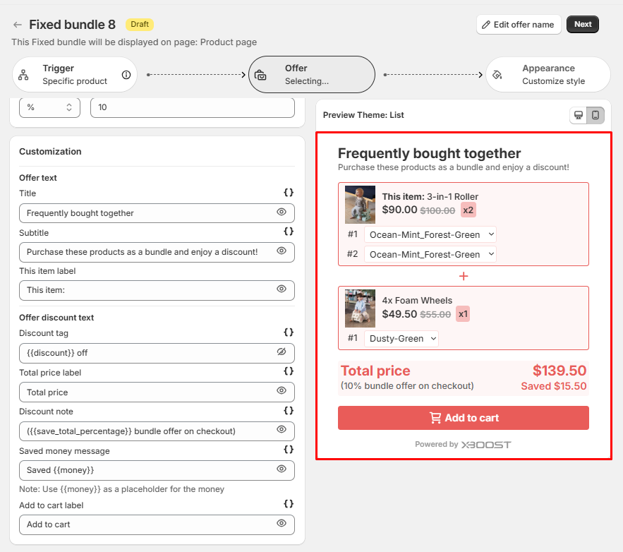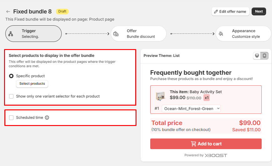The Fixed Bundle offer allows you to choose ‘Trigger’ and ‘Offer’.