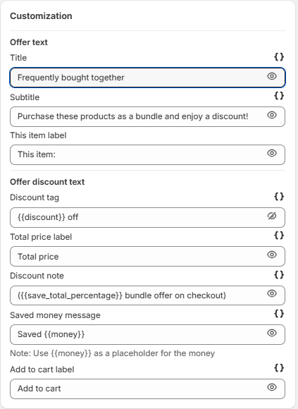 - Offer discount text includes Discount tag, Total price label, Discount note, Saved money message and Add to cart label.