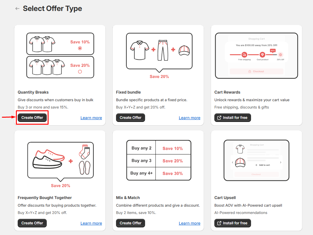 • Click Create offer from the Xboost: AI Upsell & Bundles app’s offers page.