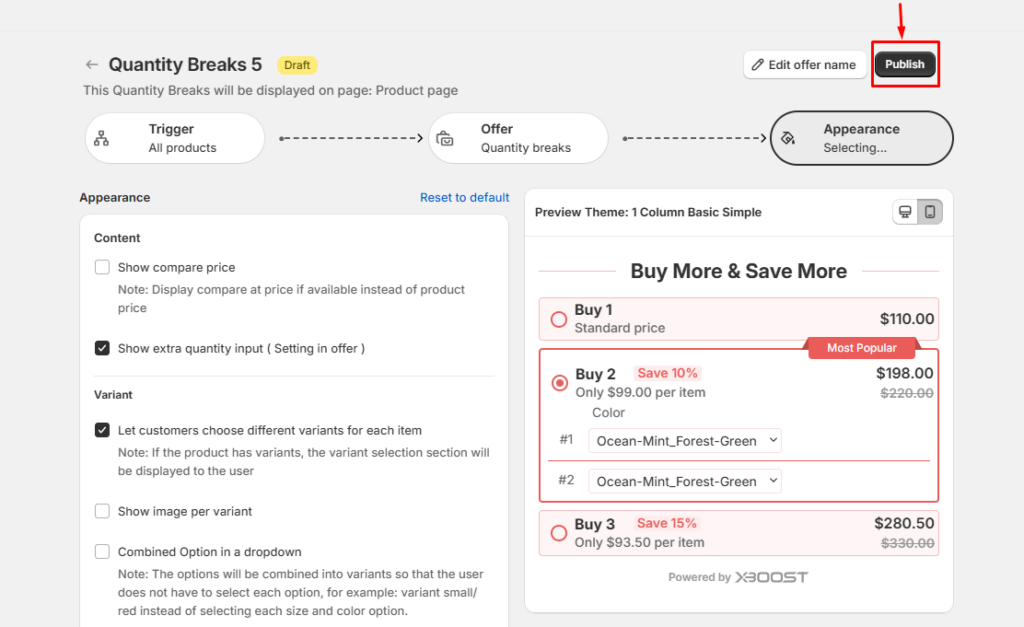 • Click Save and Publish to complete creating a quantity breaks offer.